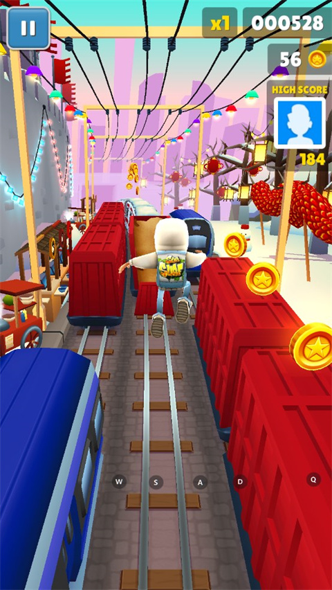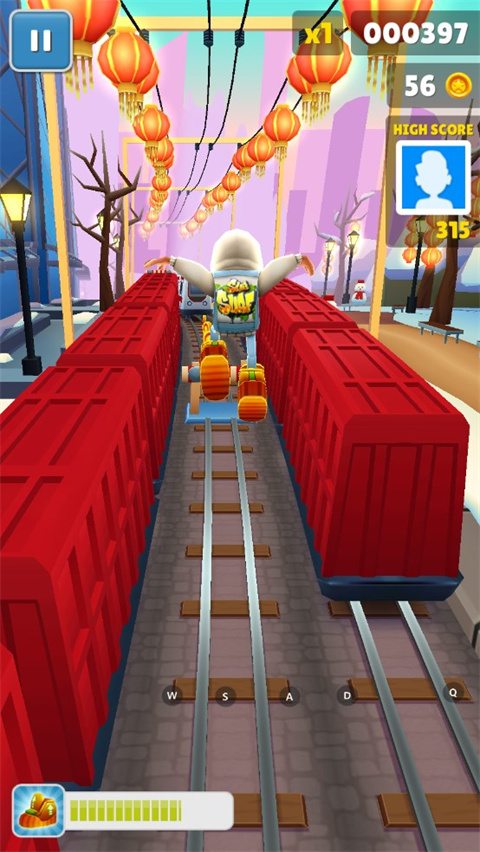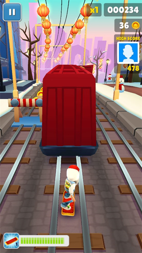 地铁跑酷北京版本,这一次我们将游历这座充满历史气息的古城,从四合院到长城一路走走看看,穿过满是灯笼的地铁轨道,收集喜庆的吉祥龙,体验十足的中国风,或许你会有不同的感受。游戏背景设置在北京地铁,场景设计非常逼真,玩家仿佛置身于真实的北京地铁中。地铁车厢内部、车站地形、路标标识等都栩栩如生,给人以沉浸式的游戏体验。