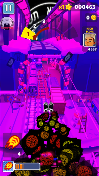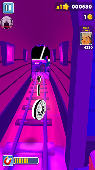 4、随机应变沉着应对,学会默数滑板的消失时间,以及优化跑酷路线(何时放开的捡道具、游戏币,何时选择安全路线为主)不要顾此失彼。