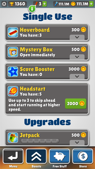 这里的双倍是速度上的提升,由正常状态下的*30变为*60速度,随着速度的提升,积分也会*2的增长,如果新手玩家觉得难以掌控,可以不去吃,其风险程度远高于超级运动鞋。通过开启神秘盒子和商店购买,都可以得到喷气包,小包可持续250m,大包为1000m,不过该道具只能在开场时使用,而且在空中不能获得金币;