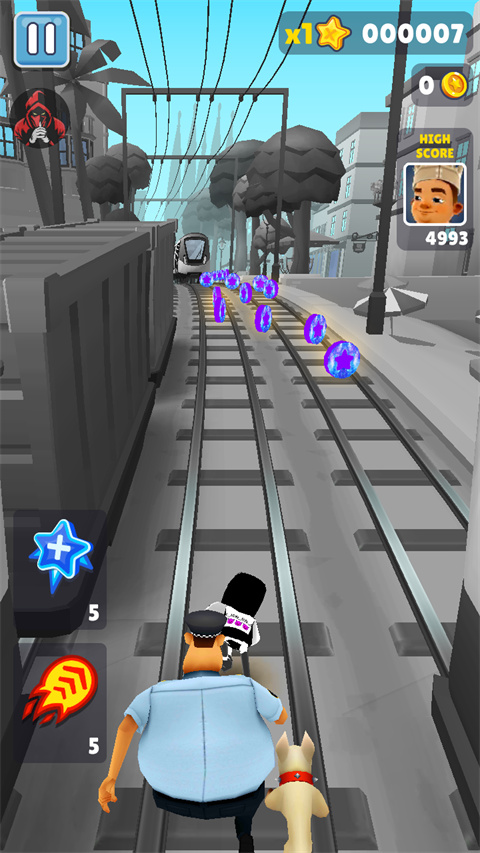 3、除了最基本的跑酷和收集金币和道具,地铁跑酷更有趣的是任务系统,地铁跑酷游戏中可以有几种不同的任务类型。任务包括“收集500枚金币”“赢得1000分”诸如此类,任务达成之后将会在你完成当前一局游戏之后显示在主屏幕。