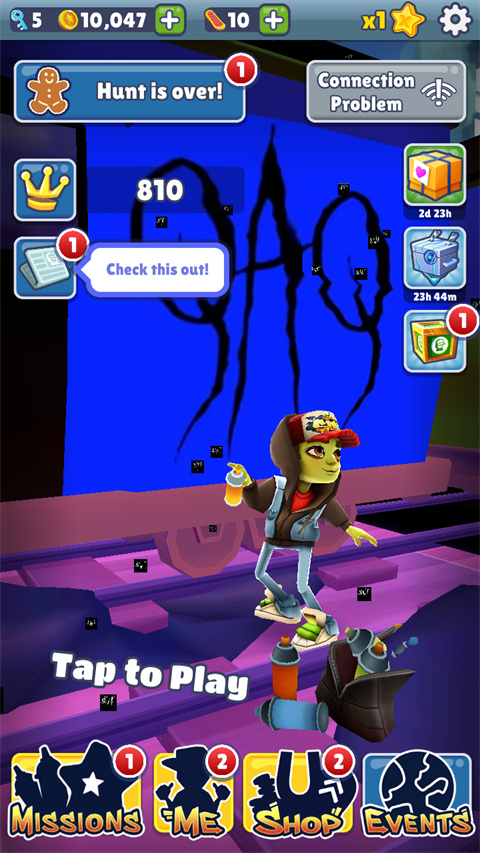 双击屏幕可启动滑板道具,如果在没有启动滑板功能的情况下,角色撞上障碍物或者火车游戏就会结束,而在滑板状态下,等于给角色买了保险,滑板会在撞到障碍物时消失,但游戏可以继续进行。滑板在消失后的几秒内出现冷却时间,当闪烁结束后可通过双击再次启动,没有次数的限制。
