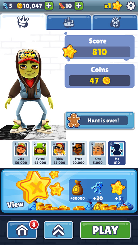 地铁跑酷eurfex版本是最新的一款地铁跑酷定制版本,游戏真名为(Subway Surf[EURFEX]3.5.0),下载进入游戏后,您会发现游戏的初始角色已经发生了改变,那是特意修改定制的绿色版主角。不仅如此,当您开始游戏后,又会发现游戏内的金币与场景都发生了变化,游戏金币变为圆形浅蓝色冰冻表情,拾取之后在游戏结算页面会转变金币,趣味性十足,同时,游戏场景更换成了以紫色系为主的暗黑系地图,还有黑色的雪花飘落,并辅以动感压迫的背景音乐,给玩家一种阴森森的游戏体验。此外,游戏的玩法与主要特色还是与原版无差的,还是大家熟悉的跳跃翻滚和左右切换道路,躲避面前的障碍物和驶来的列车,如果你的技术够好的话,可以用这些简单的操作完成高难度技巧,所以只要玩过地铁酷跑的玩家,那么这款地铁跑酷eurfex版本一定能轻易上手。