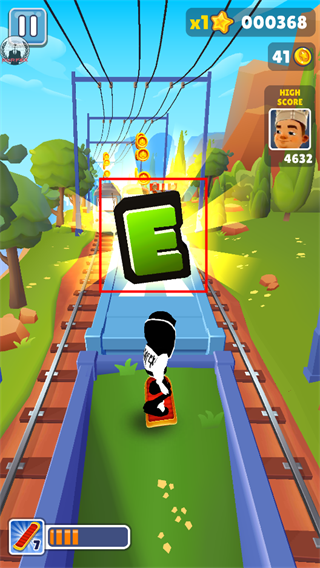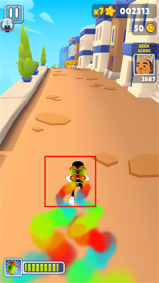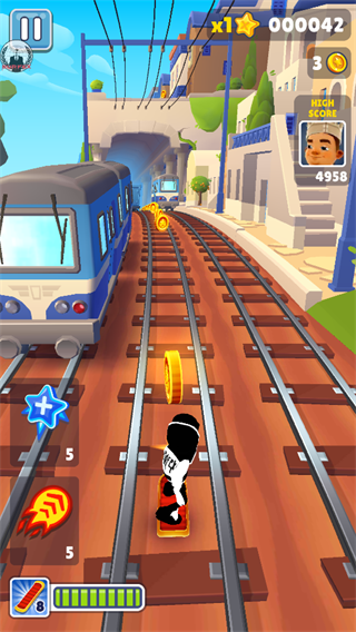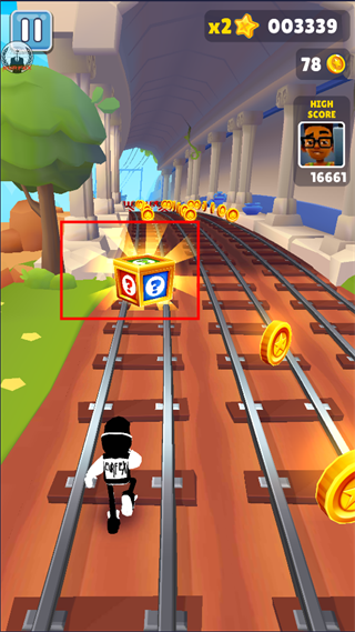 5、通过双击屏幕来启动滑板,滑板会持续一段时间。在没有滑板的情况下,角色撞到火车或者障碍等都会被抓住,游戏终结。但在有滑板的状态下,角色就有了一道保险,撞到火车等的时候,滑板会消失,游戏可以继续进行。