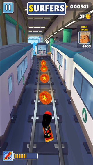 双击屏幕可启动滑板道具,如果在没有启动滑板功能的情况下,角色撞上障碍物或者火车游戏就会结束,而在滑板状态下,等于给角色买了保险,滑板会在撞到障碍物时消失,但游戏可以继续进行。滑板在消失后的几秒内出现冷却时间,当闪烁结束后可通过双击再次启动,没有次数的限制。
