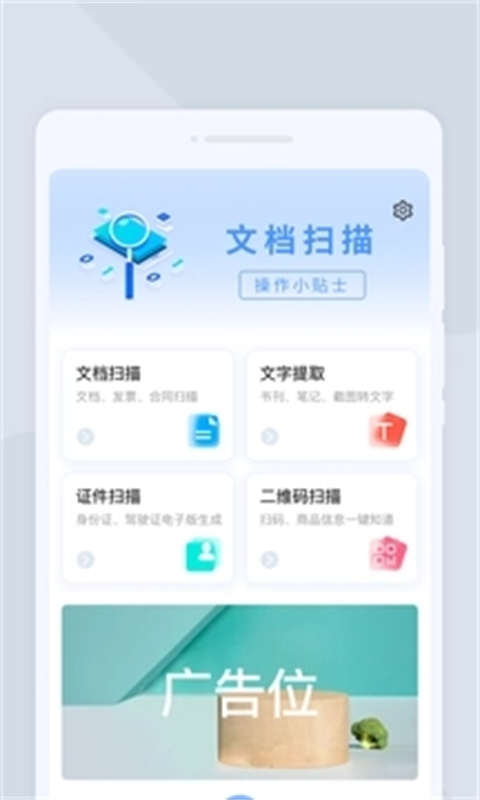 1、打开软件,可以看到软件可以文档扫描、文字提取、证件扫描、二维码扫描等,如图