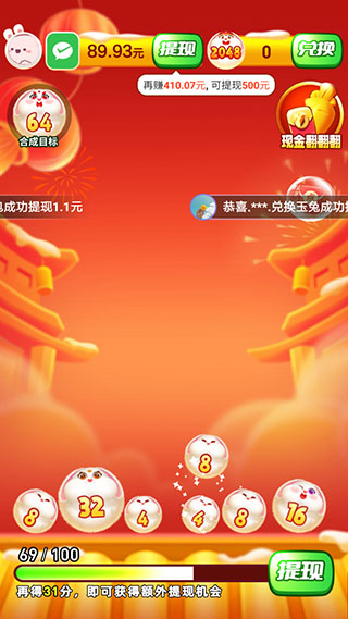 玉兔送福官方正版是一款很有趣的休闲小游戏,玩法简单又赚钱。游戏画面可爱,充满了节日气氛,玩的时候感觉挺开心的。操作就是合成相同数字的小球,越合成越大,还能获得红包奖励,真的不错!每次合成达到一定目标就能领钱,比如两个小球可以赚0.3元,15个就能拿25块,这样的小目标还挺有动力的。
