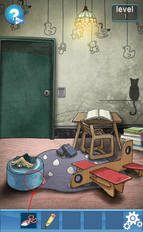 1、首先来到第一关,点击拿走地面上的剪刀还有木桌子上的铅笔。