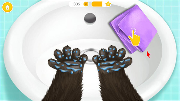 8、清洗干净后,玩家根据提示用毛巾把熊猫宝宝手上的水擦干即可。