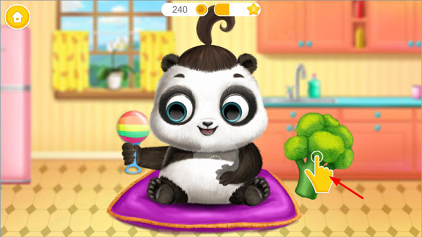 4、玩家在游戏中点击食物(西蓝花),熊猫宝宝即可吃上,每吃一口可获得一个金币;