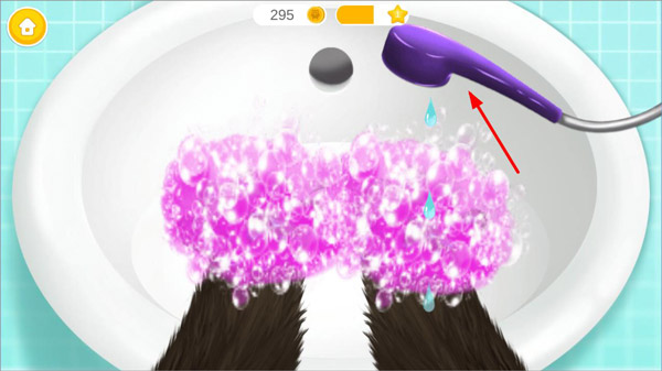 7、给熊猫宝宝双手正反面抹上香皂之后可开始清洗,玩家点击右边的花洒将泡沫冲干净;