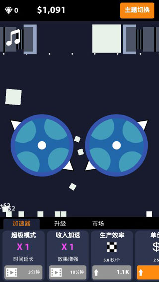 1、游戏玩法:总体来说比较简单,仅由加速器、升级和市场三位要素组成,右上角还能自主切换主题。