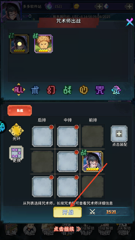 1、集合了咒、战等不同类型的咒术师供玩家培养,组建别样的对决阵容。