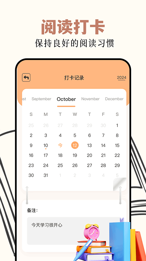 在阅读模式上,读书阁app提供了丰富的个性化设置。你可以随意调整字体大小、亮度、行间距等参数,以满足不同场景下的阅读需求,app还可提供日间和夜间两种阅读模式,无论白天还是夜晚,都能为你提供最舒适的阅读体验。除了强大的阅读功能,读书阁app融入了日常打卡和随心记录等实用工具。通过日常打卡功能,你可以养成良好的阅读习惯,做好每天的日程计划,让阅读成为你生活的一部分。而随心记录功能则让你随时随地记录灵感和想法,添加笔记,方便你回顾和总结,有需要的用户可以在本站免费下载使用。