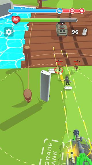 2、在游戏中你将以一人一坦克展开作战,点击屏幕任意位置即可唤出操作杆移动士兵,一路上需要不断消灭红方士兵和坦克;