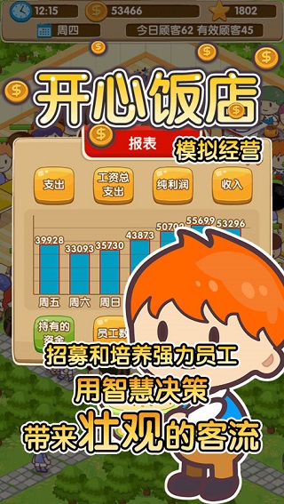 开心饭店是一款策略为主的模拟经营游戏,英文名称为“Happy Restaurant”。游戏内需要靠你的聪明智慧,将一家小饭店逐步做大。带来壮观的客流量和丰厚的收入!不同于大多数游戏,在这里,你是老板你做主,你不需要亲力亲为,你只要做决策。员工会按照你的部署搞定每天的正常营业!行人在外面路过,有几率成为顾客进入店铺消费。厨师够棒,迎宾够美,自然顾客多多啦!快来多多软件站下载体验玩耍吧!