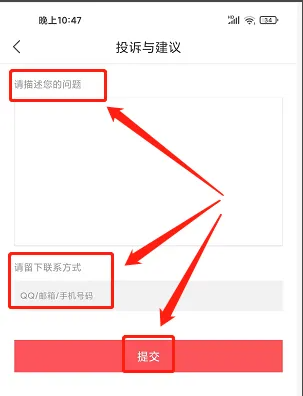 3、进入投诉与建议内容,输入描述您的问题、联系方式,点击【提交】。