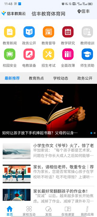 信丰教育云平台app最新版是一款功能非常实用,且便捷的智慧校园软件,主要提供家校互动、在线课堂、成绩查询、最新的教育相关资讯等功能,实现了教育机构、学生、家长之间的良好沟通,能最大限度上帮助学生学习,提高学习效率。软件运用互联网方式,结合线上、线下双重教育模式,实现了在线学习、视频讲课,包含了各年级各学科的同步练习和知识点的讲解和练习,让学生能够随时随地在线学习。
