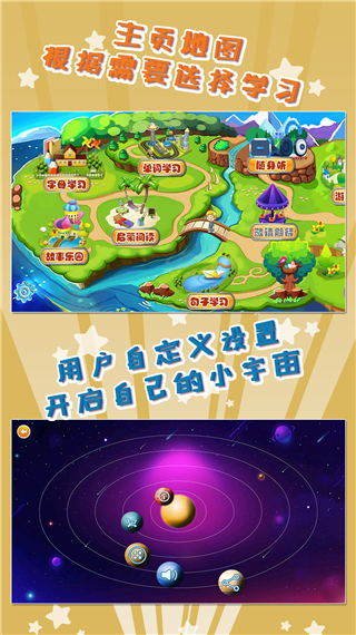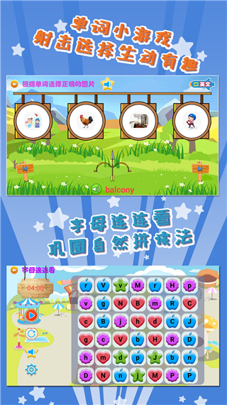 “找字母”、“补单词”、“看图片”三种不同的超炫游戏来加深孩子的游玩气氛,在游戏中学习,在学习中游戏。