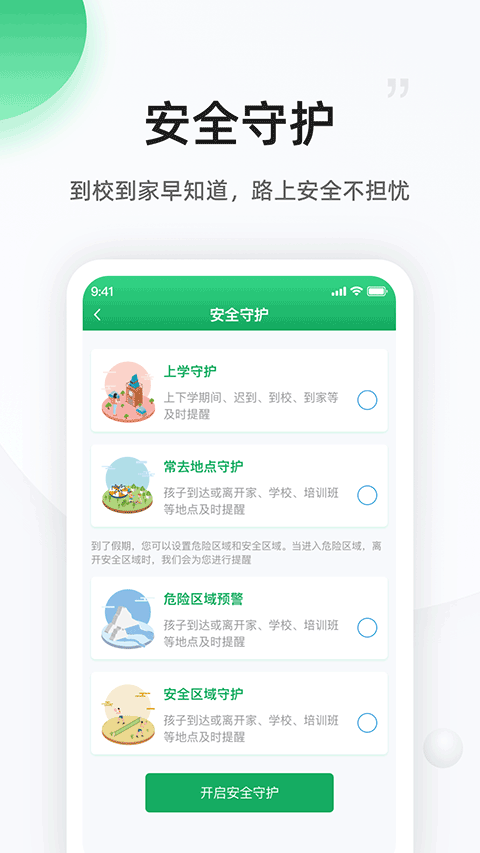 实时记录孩子当前位置和行动轨迹,可查看历史轨迹。进出常用地点、进入危险区域、离开安全区域,均会有预警,保障孩子的出行安全。