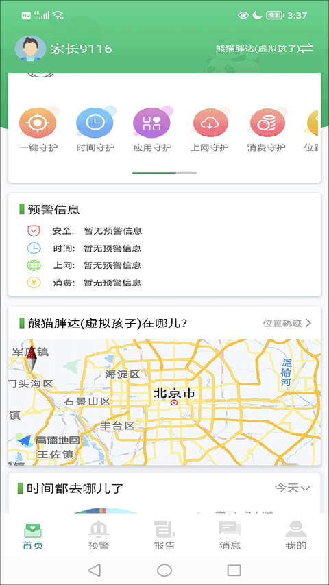 如果你平时上班很担心自己孩子的动向,那么熊猫守望家长app非常适合你,这是一款专门针对家长们设计和开发的守护软件,在软件上用户可以通过时间、应用、上网、消费、位置、关爱来时刻关注孩子的基本动态,软件在必要的时候可以根据实际情况选择预警,在分析了每日、每周、每月的统计后还会为家长们展现出一个完整的表格,让家长们针对性的对孩子的行为做出干预,希望能够及时发现孩子异常状况的家长们就快来下载体验吧。