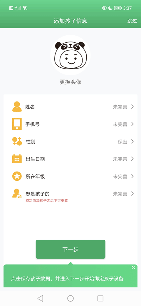 3、在添加孩子信息中填写好姓名、手机号、性别、出生日期、所在年级、监护人后点击下一步;