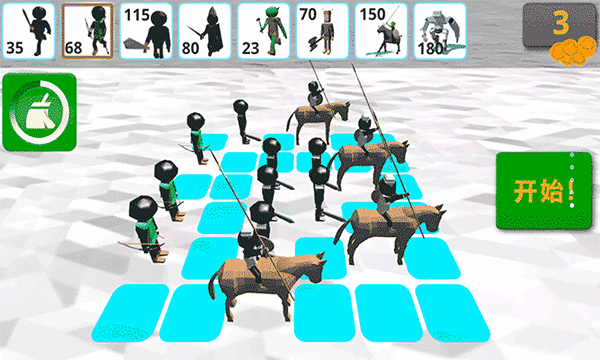 1、点击地上的蓝色方块就可以将火柴人布置好位置,你需要建立一个最强的军队。