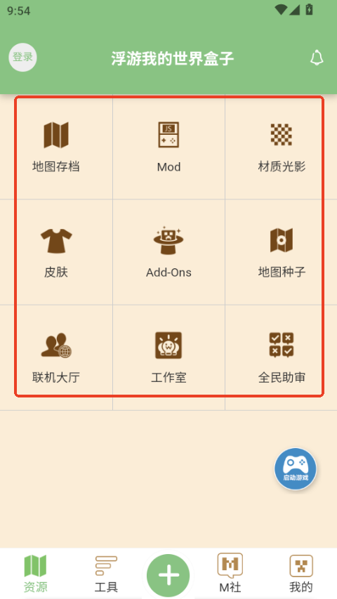 1、在本站下载安装好浮游盒子app官方正版,运行软件,这里有各种功能,如地图存档、mod、材质光影、皮肤等等,你可以根据你自己需要的功能,点击进去;