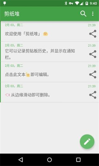 剪纸堆app是一款极致轻便的多功能剪贴板管理工具,该软件体积小巧玲珑,仅有3兆不到大小,整体设计简洁朴素,无任何繁杂设计,功能丰富实用,可对剪贴板内容进行收藏、合并、备份等管理操作,并且没有数量限制,可以无限保存也可设置剪贴板保存时限,1天、7天、30天或者永久,总有至少一种适合你使用,堪称强大。对于广大有强迫症的用户来说,本软件还是相当值得拥有的,而且完全绿色不收费这点也十分亲切,欢迎下载使用。