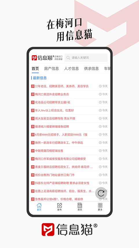 信息猫是梅河口生活网(梅河口信息网)的全新升级版,软件内数据与梅河口网站数据实时同步,致力为用户提供最新一手的梅河口生活信息,无论你是需要那一方面的信息,是对人才需求的招聘也好,是有买卖车辆的需求也罢,在这里通通能快速实现,帮助用户一键找到自己需要的内容。且软件使用起来也极为便利,没有复杂的软件界面设计,也没有病毒弹窗和烦人的公告弹窗,保证用户使用过程是非常简洁干净,所有需要的内容只需要点开信息即可浏览。对此,有需要的用户快来本站免费下载体验一下吧。
