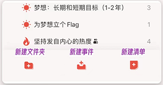 1、新建事件、新建清单、新建项目。(分类视图下首页可新建事件,在首页-计划中可看到新建图标)