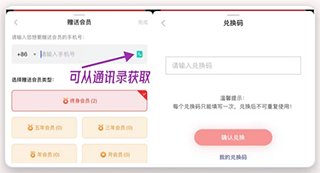 7、用户可以通过手机号将会员赠送给他人,也可以使用兑换码兑换会员。