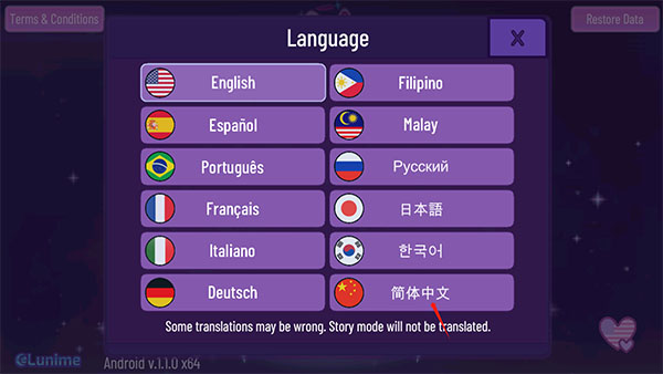 加查星云有多个版本,这里提供的是第一个版本,也就是老版。如果你想玩中文版,可以按照步骤设置:进入游戏后点击右下角,选择简体中文就能显示中文了。另外,更换人物也很简单,选中角色后可以直接切换或根据特征查找,并调整外貌。