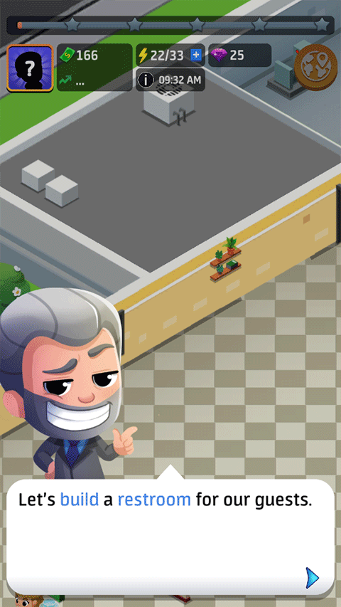 7、餐厅当然不能缺水卫生间了,点击空地让我们为客人建一个卫生间。同样的如果要用新的区域或桌子扩展您的餐厅,只需点击办公室即可!