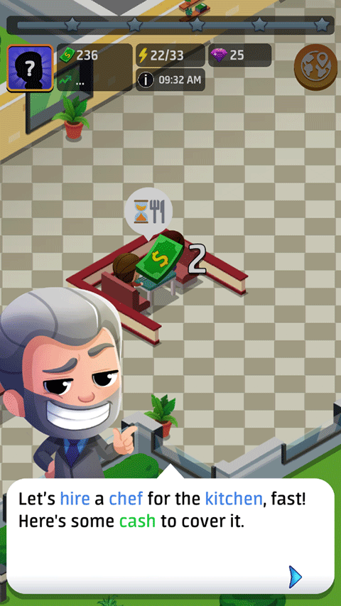 最后,用你赚的钱来升级你的餐厅,解锁更多桌子,支付员工工资,吸引更多的客人。