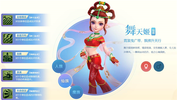 舞天姬明眸珠辉,瑰姿艳逸,生性善解人意,令人如沐春风。一舞绡丝动四方,观之心魂俱醉。