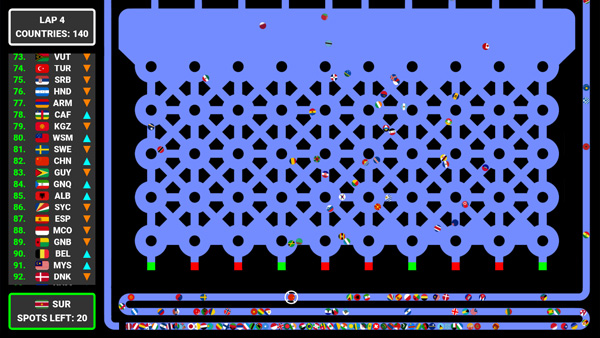 我玩了一会,发现弹珠有时候会突然加速,或者碰到奇怪的机关,这种随机性让比赛充满了变数,还挺刺激的。尤其是当你选的国家弹珠一路杀到决赛,那种感觉特别爽。不过游戏也有点小问题,比如有些关卡设计得有点难,而且道具系统感觉不太平衡。