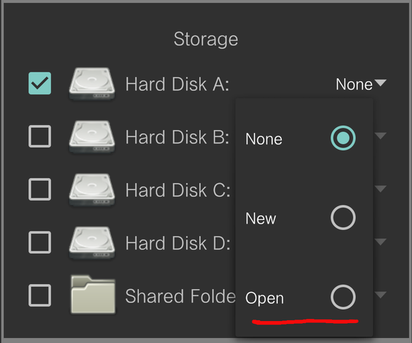 6、这里当你点击磁盘A后面的None时,会弹出小窗口,这里要选择打开而不是New。New是新建一个空镜像,而打开则是手机自带或者limbo内置的文件管理器,让你选择镜像。