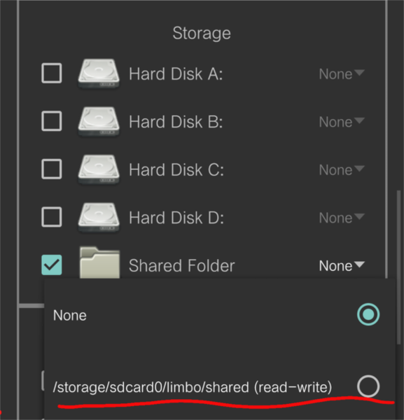 磁盘,将Hard Disk A打勾,然后点击旁边的none,选择open,在存储路径中找到你需要模拟的镜像,然后选择即可,当然底下有个共享文件夹的选项(Shared Folder),这个其实类似于bochs的hd文件夹,可以与镜像内进行文件传输,如果需要打开的话同理,先打勾,再选择路径,需要传输文件时将文件放入limbo文件夹的shared文件夹中,再打开镜像即可,但是这里要注意,这个共享文件夹最多只能容纳503mb的文件,如果在这个文件夹中的所有文件大小总合超过了503mb,那么就会导致虚拟机闪退