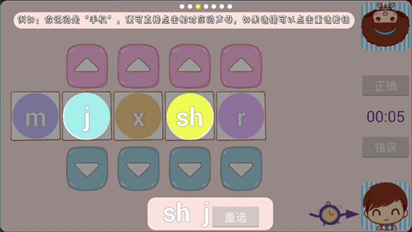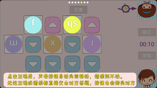 5、点击正确后,声母按钮自动向前移动,错误则不动,无论正确与否都直接交由对方答题,按钮也会转向对方;