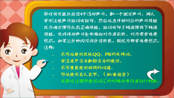 游戏规则是这样的:双方会随机得到4个活动声母和一个固定声母,需要用这些声母组词或造句。点击对应的声母按钮,如果正确就能推进对方那边的声母,错误的话就轮到对方继续玩。谁先把所有声母推到对方那边,谁就赢了。输了的人要接受惩罚,三分钟内分不出胜负,双方都要受罚。