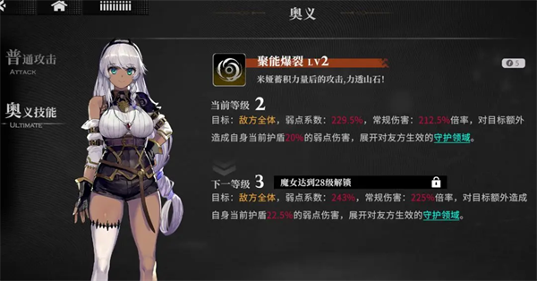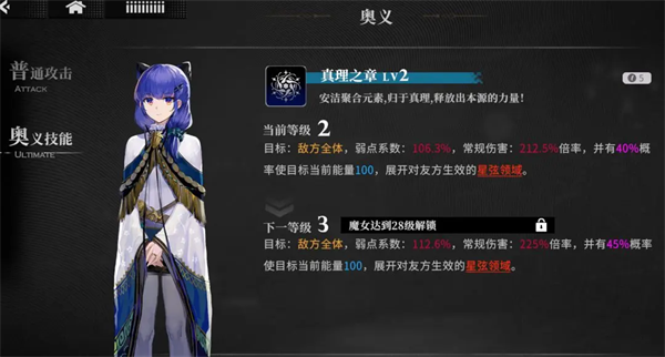 奥义技能(1级):目标,敌方全体;展开领域,领域效果:弱破效果提升5%。若攻击单体,追加弱点伤害。