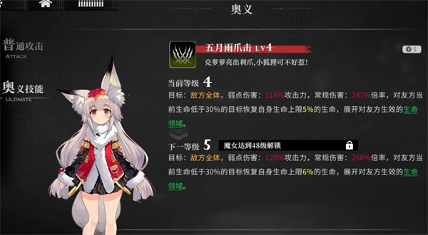 普通技能(1级):目标:敌方单体;自身攻击提高5%,持续下次常规伤害。