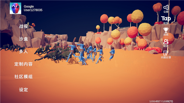全面憨憨战争模拟器国际服(TABS Pocket Edition)是一款沙盒战争模拟手游,提供战役、沙盒、多人联机、定制内容模式,其中包含8种战役、19种地图可以体验,还拥有自定义战争模式设定,其内的大量模组玩家可以下载体验。在玩法上,玩家将在这里布置上百种兵种进行策略布局,并利用战役地图合理制定花式布兵打法投入战场,极致的策略才是最终王道。此外,全面憨憨战争模拟器国际服还支持多人联机进行战役,与好友进行PK。