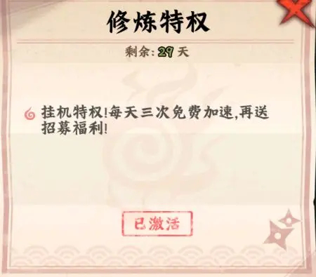 加速修炼:加速修炼可以快速获得经验,玩家首次加速可免费获得2小时收益,再次加速需要消耗忍币。每日最多可加速3次,每日0点更新次数。修炼时间达到上限后,不会在获得收益,因此玩家需要及时领取收益。