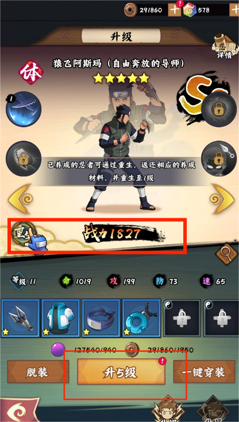 忍者升级/进阶:消耗经验丹和铜币可提升忍者等级,忍者达到一定等级后需要消耗进阶手札和铜币进阶后才能继续升级。
