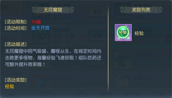 无尽魔窟是经验获取最快途径,但建议在拿到首充2倍经验药水后,且将所有日常任务清完、战力提升至巅峰时再进行挑战
