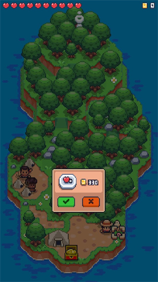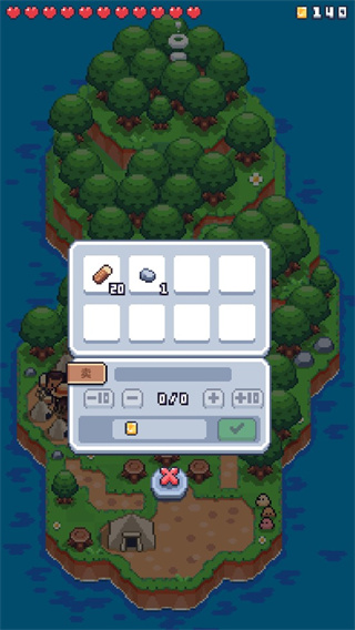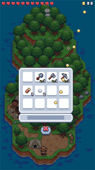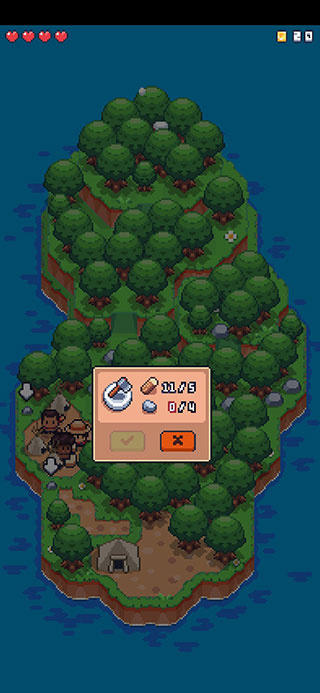 《迷你荒岛求生最新版》是一款像素风的野外冒险小游戏,玩家扮演的主角流落到一个被海环绕的小岛上,开局只有一个铲子和一些体力。游戏一开始看起来资源匮乏,但通过不断砍树、挖矿石和解锁新道具,可以逐步探索更广阔的区域。比如用小铲子砍倒小树后,会遇到土著并用矿石换斧头,斧头又能砍更大的树,这样就能继续深入探索。