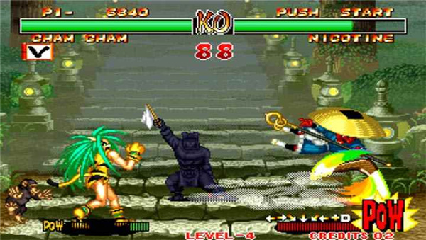 游戏《侍魂2》的玩法也跟游戏机上一模一样,在游戏左下角玩家通过操作摇杆来控制人物动作,右下角设置有4个按键,分别控制拳,脚,放宝和暴气。简洁的按键操作可以让玩家在游戏中更加直接方便地体验到格斗的乐趣。