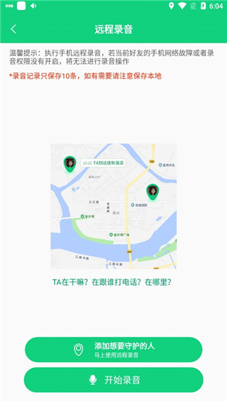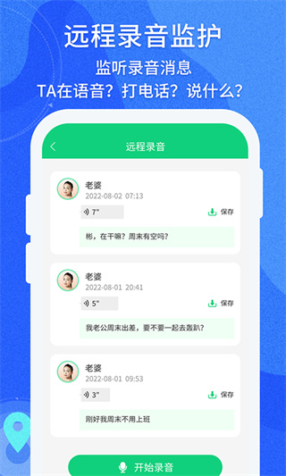 3、远程录音:通过手机远程录音,时刻掌握亲友周边环境情况,保护TA的安全;