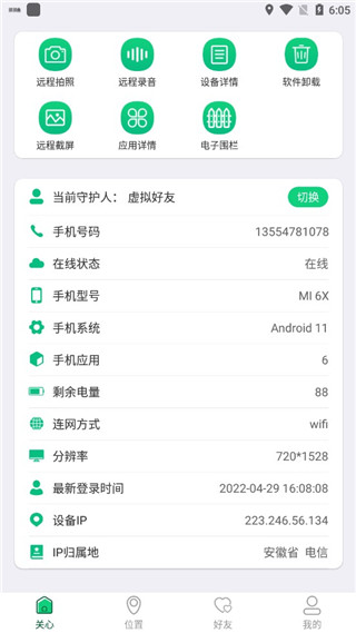 不仅如此,该软件还拥有远程录音、远程拍照、远程截屏等等强大的功能,通过手机远程录音以及手机前置、后置摄像头拍照,用户可以时刻掌握亲友周边环境情况,并通过手机截屏,能够时刻了解他们的手机使用情况。守护亲友app不仅可以协助家长时刻守护孩子的安全,还可以在平台里面来查看家里老人的实时情况,再也不用担心老人走失,帮助广大用户更好的进行生活管理服务。值得一提的是守护亲友最新版致力于让手机成为保护家人的好帮手,让在外工作的人们时刻掌握家里人的安全情况,出门在外再也不用担心家里人的安全,感兴趣的朋友欢迎前来下载使用。